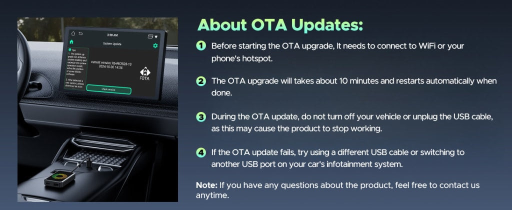 Plug the box into your car’s USB port, enable CarPlay on your iPhone, and enjoy automatic wireless connection.