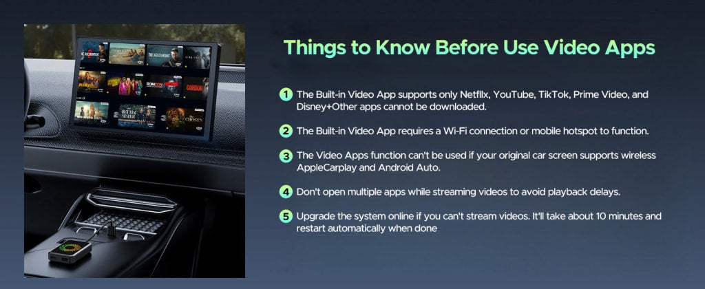 Stream Netflix, YouTube, and TikTok directly on your car’s display during breaks or long road trips.